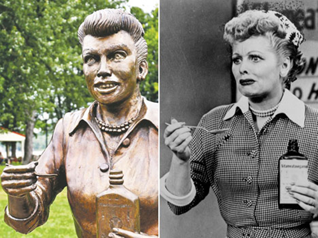 · सन् १९५० की चर्चित हलिड नायिका लुसी स्टार्सको यो मूर्ति साँच्चीकै कुरुप छ । दायाँ भागमा उनको सक्कली चित्र छ र सोही चित्रलाई नक्कल गर्दै बनाइएको मूर्तिमा उनी निकै नै कुरुप देखिएकी छिन् ।